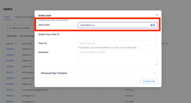 On the LiteLLM Proxy UI, go to Users > Create User > Enter the user's email address > Create User.